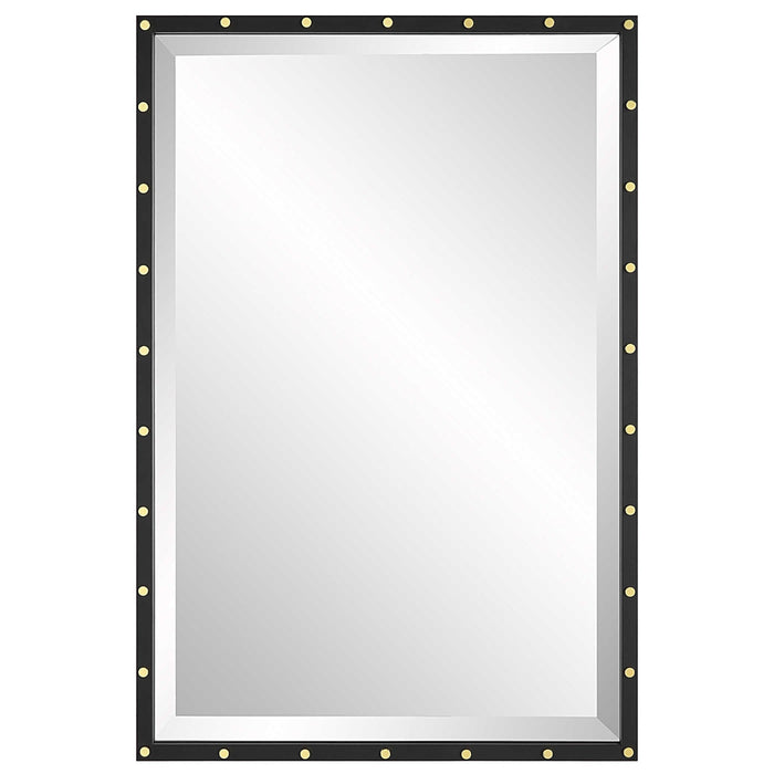 The Uttermost Benedo Vanity Mirror combines a modern urban industrial design with a sleek matte black iron frame and plated brass screw caps accents. The generous 3cm bevel provides an attractive finishing touch, and it's designed to be hung either horizontally or vertically.