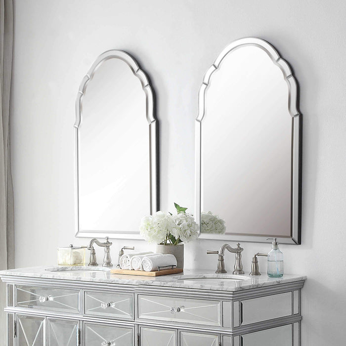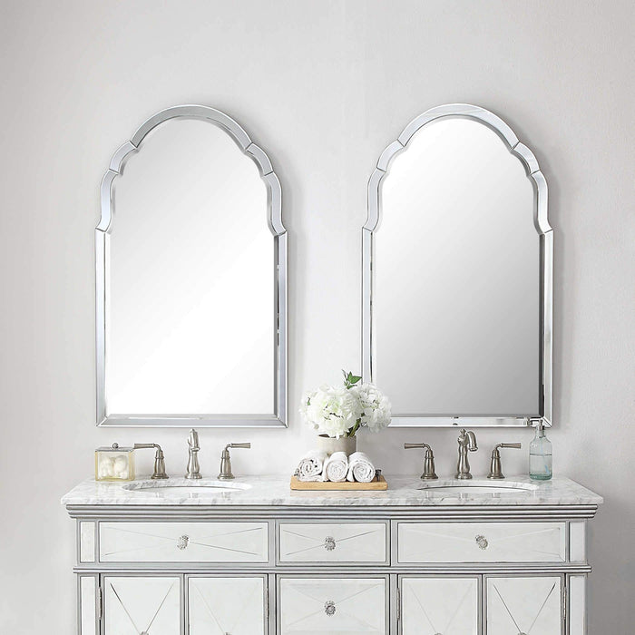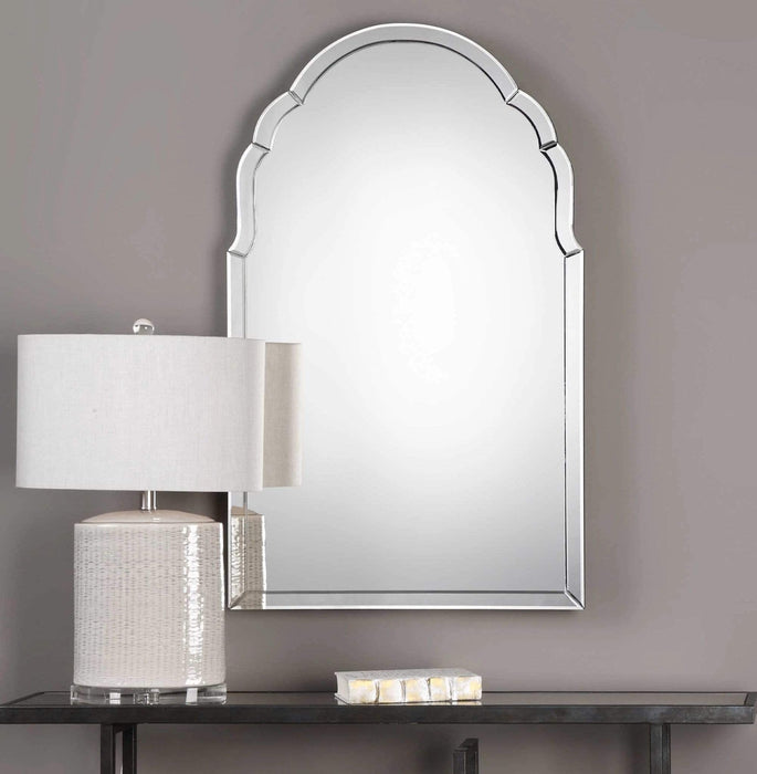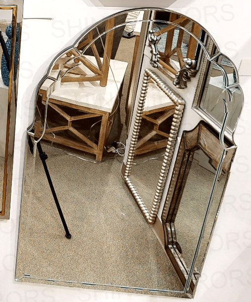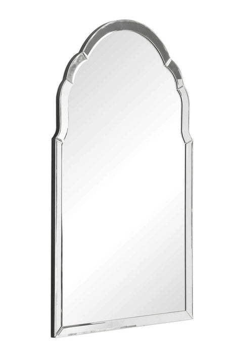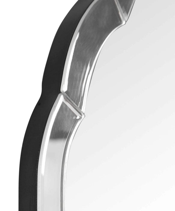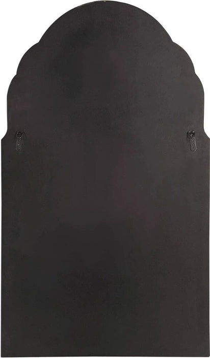 Enhance your place beautifully with this captivating wall mirror. A timeless wall mirror piece highlighting a sophisticated arched top shape design. This frameless wall mirror is envisioned with curved, beveled mirrors with a solid wood backing, painted in black colour.