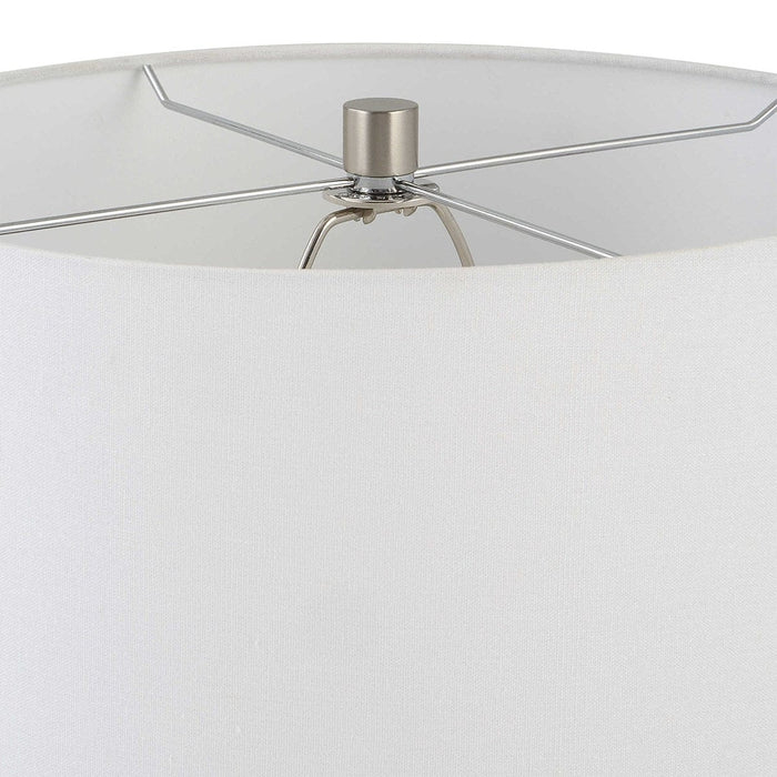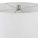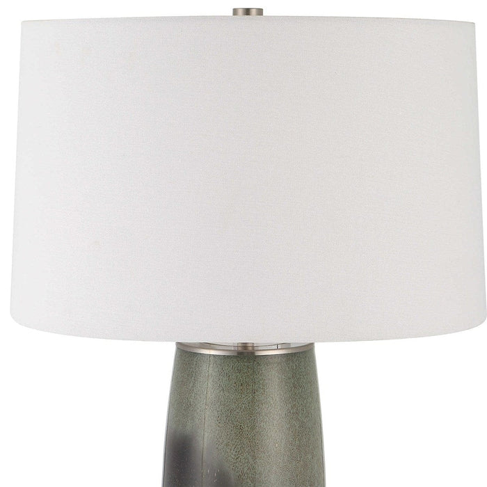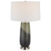 The Uttermost Campa Table Lamp is an elegant statement piece for any room. Its hand-crafted ombre gray-blue and green glass base boasts crystal accents and brushed nickel finished iron details, giving your space a luxurious feel. Topped off with a slight tapered hardback shade in white cotton fabric, this lamp is sure to elevate any space.