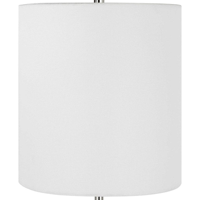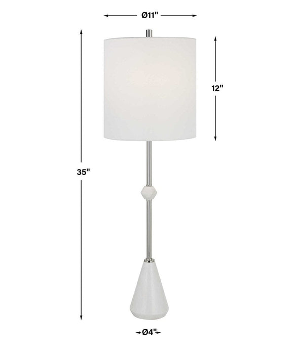 The Uttermost Chantilly Modern White Buffet Lamp is an elegant addition to any home. Boasting a honed white marble base and polished nickel plated accents, this buffet lamp creates visual sophistication with its detailed design. Not to be overlooked, a white linen round hardback shade completes the look.