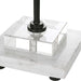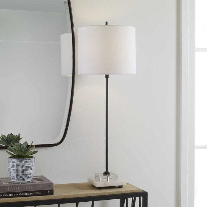 This modern Uttermost Ciara Sleek Buffet Lamp features a satin black metal base perched atop a stunning crystal slab and white marble foot with subtle veining. The lamp is completed by a round hardback shade wrapped in white linen fabric, providing a sleek and stylish look for any room.