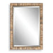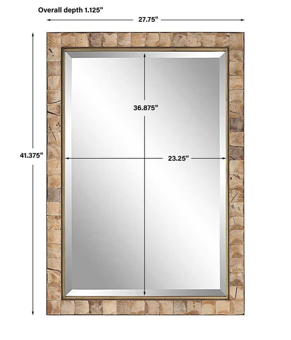 The rectangular Uttermost Cocos Wall Mirror features an iron strap frame with a dark gold finish. It is adorned with concave, polished coconut shell inlays that add to its authentic character. Each shell has a unique color, and the mirror has a 1.25" bevel and can be hung either horizontally or vertically.