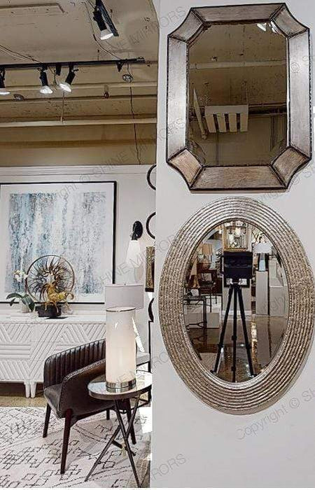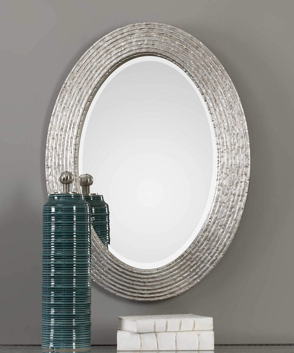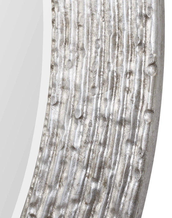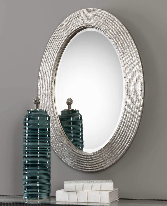 This burnished silver oval mirror is perfect for modern industrial interior style. Featuring a beautiful hammered texture made into semicylindrical moldings frame which makes this piece an elegant addition to your room.