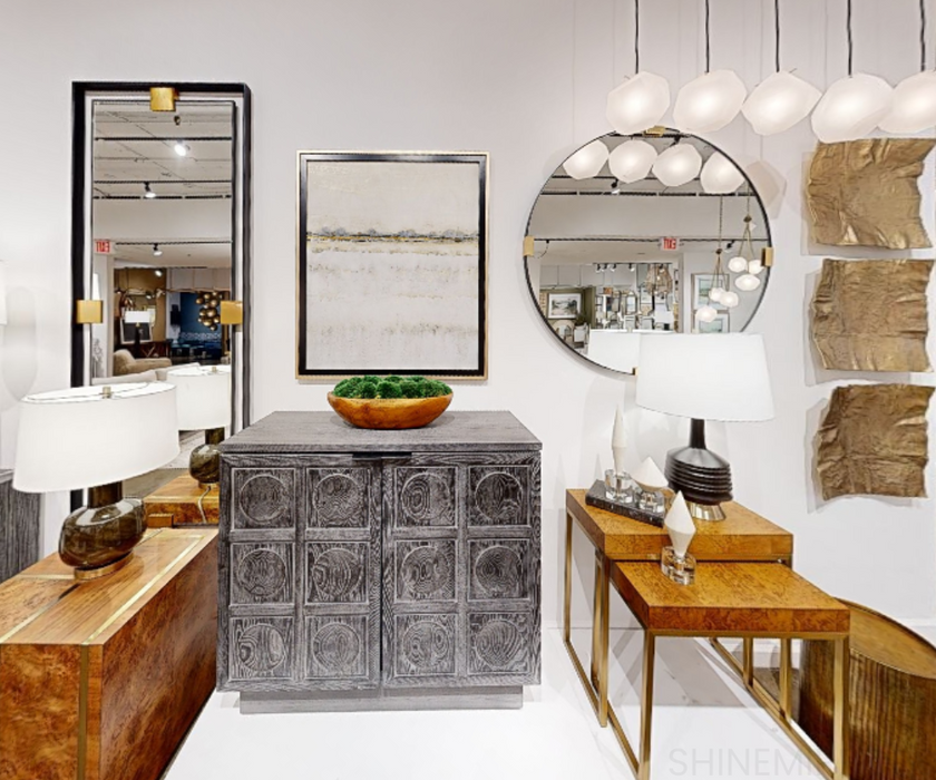 The Cornerstone Mirror boasts a grand size and is adorned with plated brushed brass accents. It is surrounded by a metal free-floating frame with a smooth satin black finish, creating a striking visual contrast. Hang it horizontally or vertically for versatile placement options.