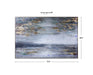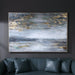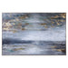 An abstract landscape artwork that uses moody shades of grey and white. It has accents of charcoal and gold leaf tones with subtle green and slate blue details. The combination of the hues in this piece is reminiscent of the vibe during dusk and its mysterious darkness. This artwork is made even more elegant with its gold gallery frame.