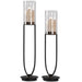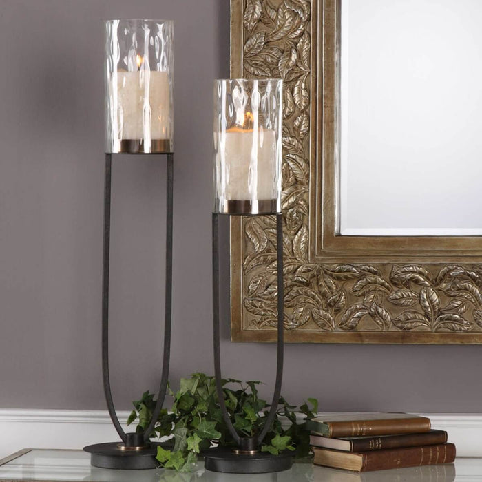 The Uttermost Durga Iron Work Candleholders Set of 2 is a stunning addition to any space. Crafted with a matte black finish and open design ironwork, this set includes two candleholders with coffee bronze details and clear water glass globes. The perfect accent piece for your home. Two 4"x 5" distressed beige candles are included.