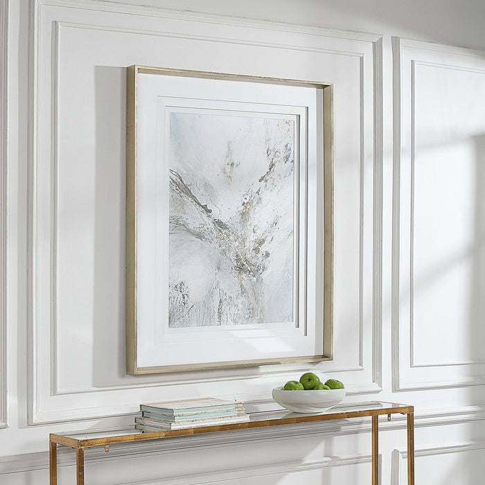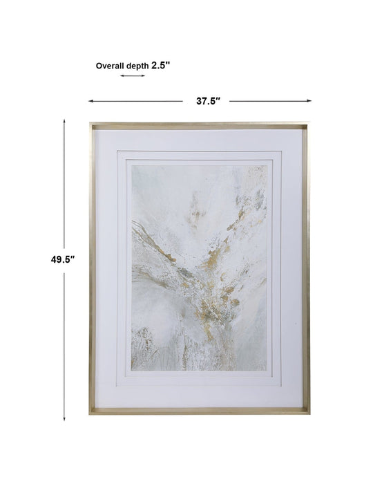 Transform your decor with the Uttermost Ethos Framed Abstract Print, a captivating art piece that oozes sophistication and grace. The neutral artwork features sophisticated shades of light gray, white, and gold leaf, elegantly framed with a warm silver leaf. Triple white matting adds texture and definition, while the glass front subtly enhances the artwork's timeless quality. This Jennifer Gardner piece promises to bring a stylish, exclusive touch to your home.