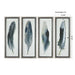 Add a touch of contemporary elegance to your home decor with this set of 4 Uttermost feather prints. The deep, dark blue and black hues provide a striking contrast against the off-white background, creating a beautiful watercolour effect. Each print is framed with a champagne silver frame and black satin inner lip, and finished with protective glass to ensure lasting beauty.