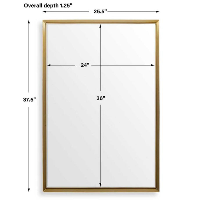 This elegant rectangular mirror features a stainless steel frame characterized by precise angles and a refined inner trim, finished in brushed brass. Designed for versatile installation, it can be mounted horizontally or vertically to complement any space with sophistication.