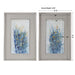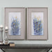 This framed set of 2 prints feature a modern interpretation of traditional floral artwork. Delicate, indigo hues are enriched with golden accents on a white background, providing a rich contrast. The pale gray linen mats compliment the distressed silver frames with dark gray accents and matching fillets. Each print is sealed with protective glass, completing the look. By Tim O'Toole.