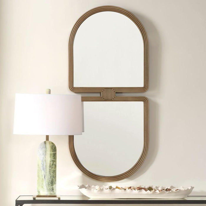This unique mirror reinvents the classic art deco style with a modern twist, deviating from traditional shapes to present a captivating silhouette. The frame boasts a smooth wooden design adorned with grooved out channels, finished in a lightly antiqued gold. The juxtaposition of shapes creates a visually striking piece that enhances any classic or contemporary interior.