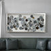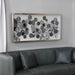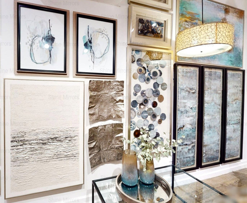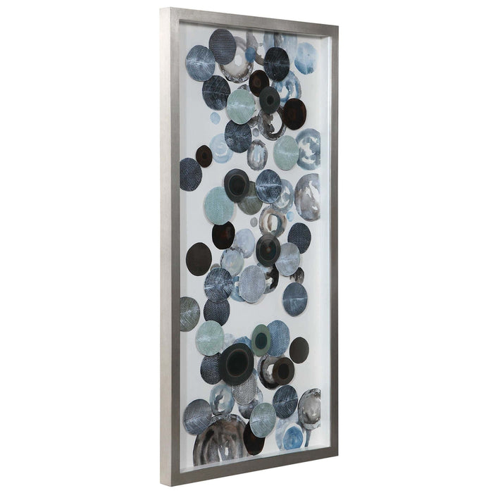 Featuring an abstract design using overlapping, blow torched iron disc. This wall decor piece uses hand painted acrylic accents in tones of silver, brown, blue, and green. The artistic wall decor is encased under a glass and in a box with a lightly antiqued silver leaf finish.