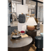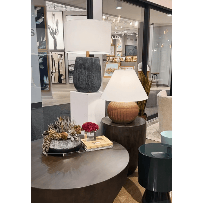Bring a touch of warmth and adventure into your space with the Uttermost Keoghan Table Lamp. The porcelain base features deep organic channels in a dark terracotta finish, accented with plated antique brass details. The large round shade adds a crisp and cool ambiance, making it the perfect addition to any room.
