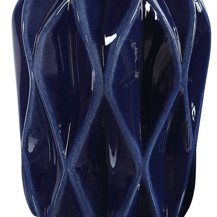 This set of two Uttermost Klara Geometric Bottles will add a vibrant touch to any room with their glossy cobalt blue finish and embossed geometric pattern. These ceramic bottles are further accented with polished nickel and crystal finials, making them a standout choice.