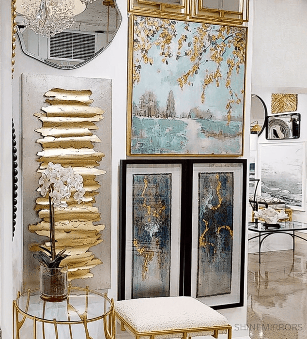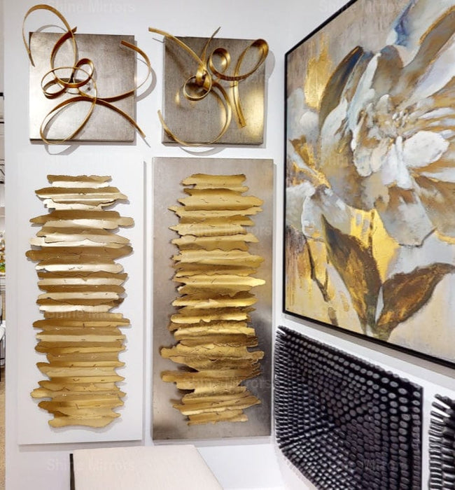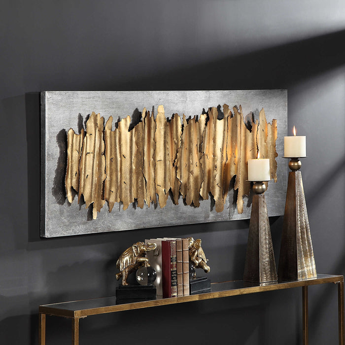Add a unique and elegant style in your space with this metal wall decor. This piece features layers of metal strips with crude edging with an antiqued gold leaf finish. It stands out because it is set on a silver leaf distressed iron backing.
