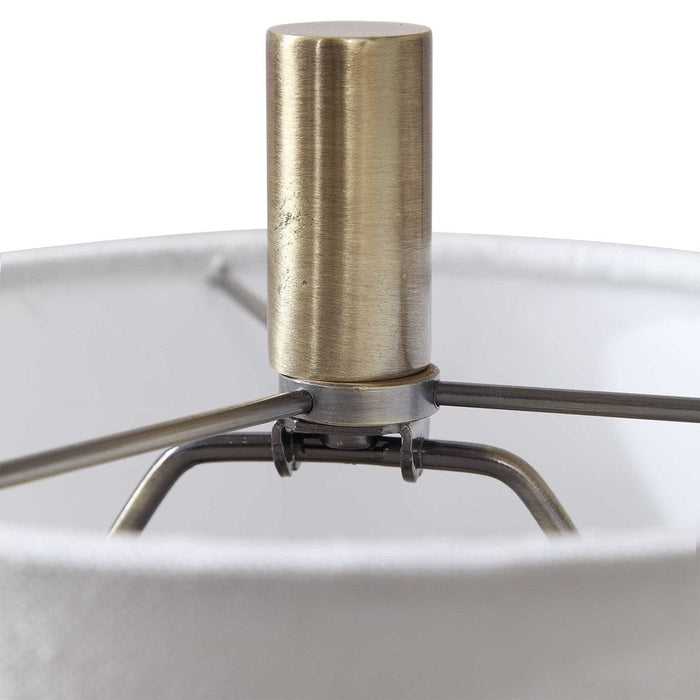 This Uttermost Minette Mid-Century Buffet Lamp is a testament to traditional design, featuring a tapered base plated in elegant antique brass and polished white marble accents. A white linen hardback drum shade completes the piece. Perfect for adding character to any midcentury-inspired space.