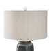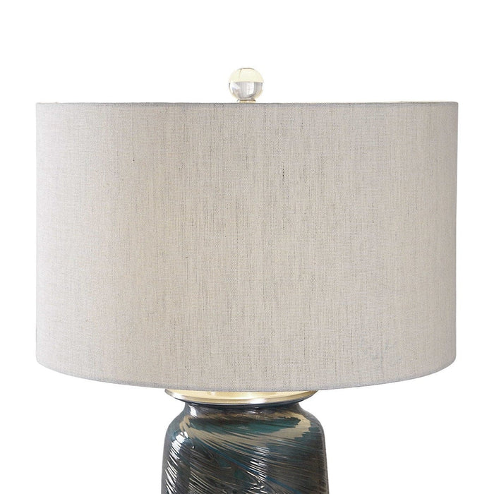 Add a splash of vibrant color to any room with the Uttermost Olesya Swirl Glass Table Lamp. Its unique swirl texture showcases shades of ocean blues, greens, and metallic bronze with brushed nickel plated details. It sits confidently atop a thick crystal foot on a beige linen drum shade. Create a captivating lighting statement perfect for any home.