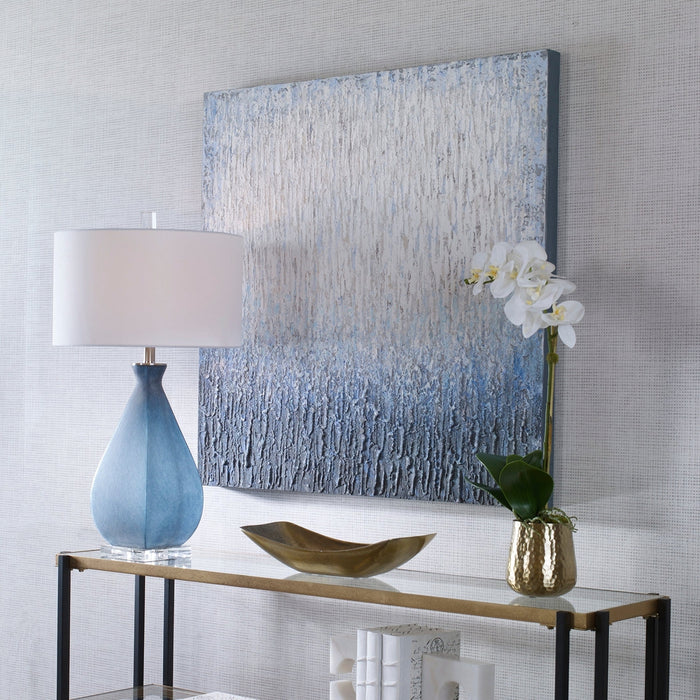 The Uttermost Outside The Window Hand Painted Art features an elegant abstract design with lush texture detailing in beautiful gradient tones of light gray-blue to deep navy. Perfect for creating a coastal atmosphere in any room.