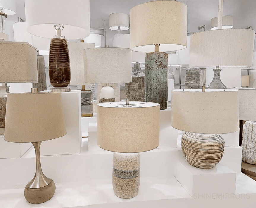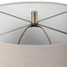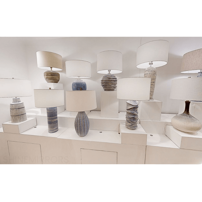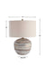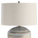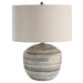 This Uttermost Prospect Striped Accent Lamp combines ceramic and light brushed brass plated details with neutral shades of brown, taupe, cream, and blue to create a sophisticated, eye-catching accent piece. Finished with a light beige linen shade and natural slubbing, this lamp is sure to be a stunning addition to your home.
