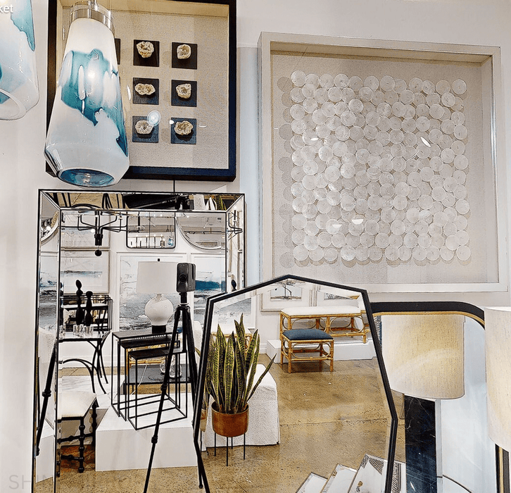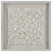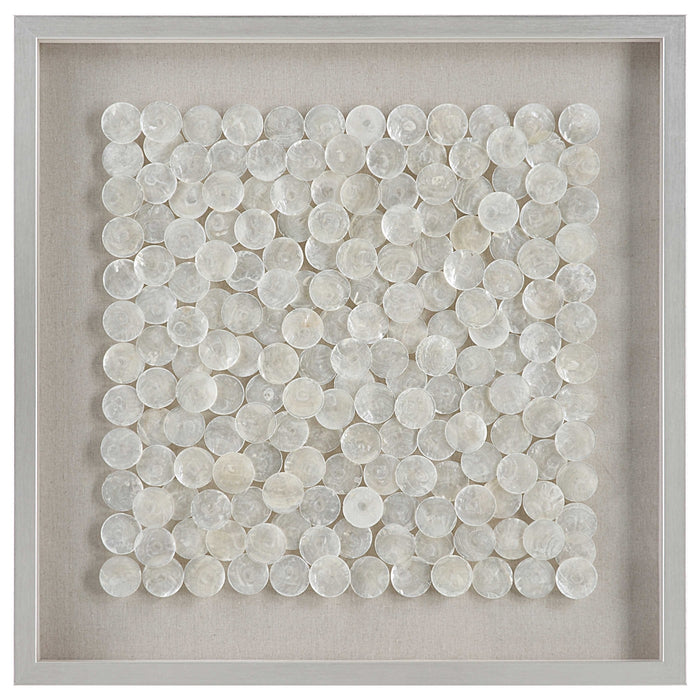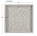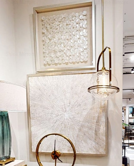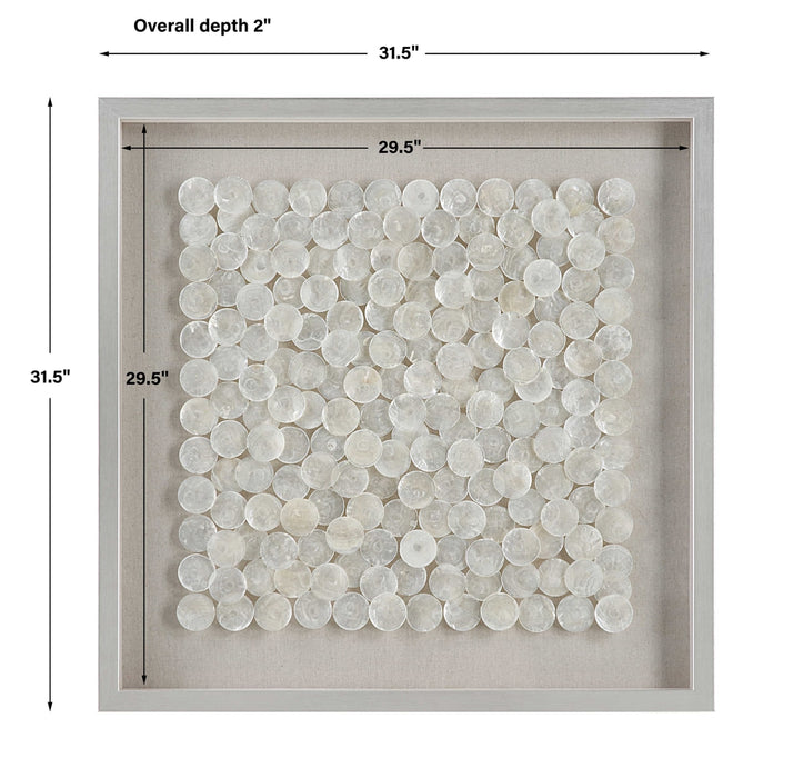This is a beautiful shadowbox style piece that features a collection of 'windowpane oyster'. Consists of layers of transparent capiz shells that shines and shimmer and will give your space that beautiful elegant touch. A flax toned linen backing is used, paired with a Pine wood frame with brushed silver colour finish.