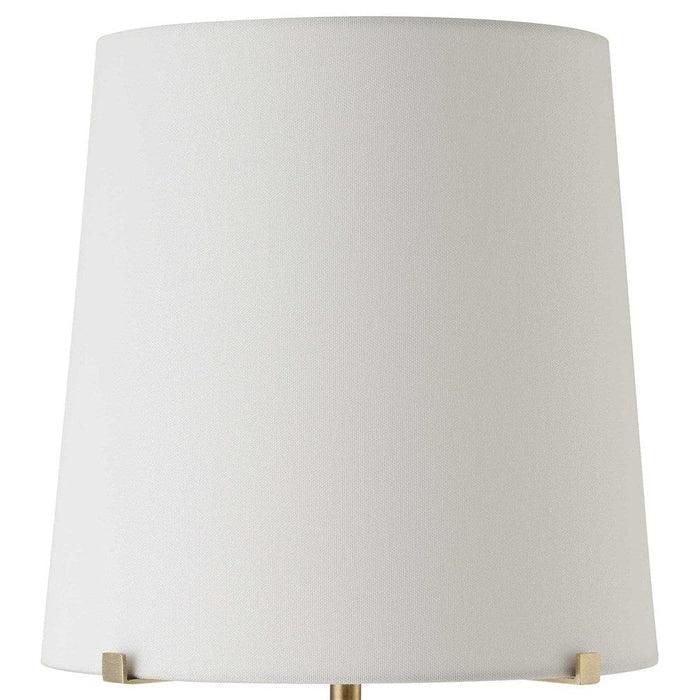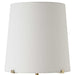 - Shade Description: Round hardback shade. Crisp white linen fabric, held in place by brass plated steel arms.
