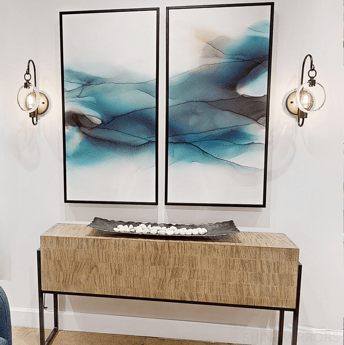 A beautiful artwork giclee on canvas that is sure to uplift your empty walls. Composed of modern watercolour colours of serene navy, teal, and beige tones, it is easy to blend to your interior theme. The set of 2 canvas is accented by a solid wood gallery frame with black finish.