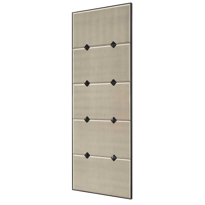 The Uttermost Serchio Full Length Wall Mirror exudes luxury and elegance with its antique mirrors and slim black iron frame. Its petite bevel adds an updated traditional appeal, enhanced with matching metal studded medallions for a classic yet distinctive finish.