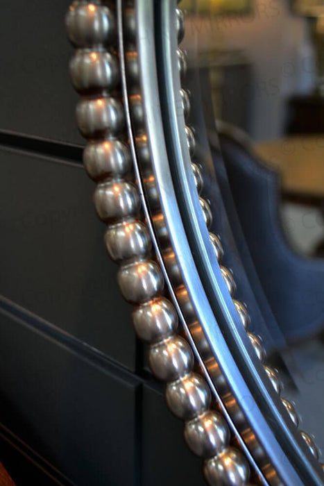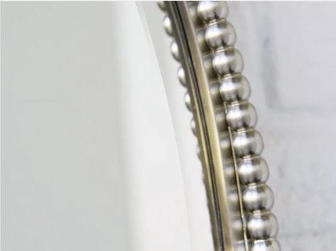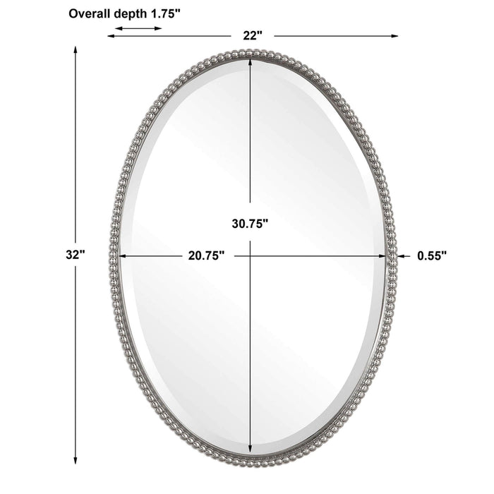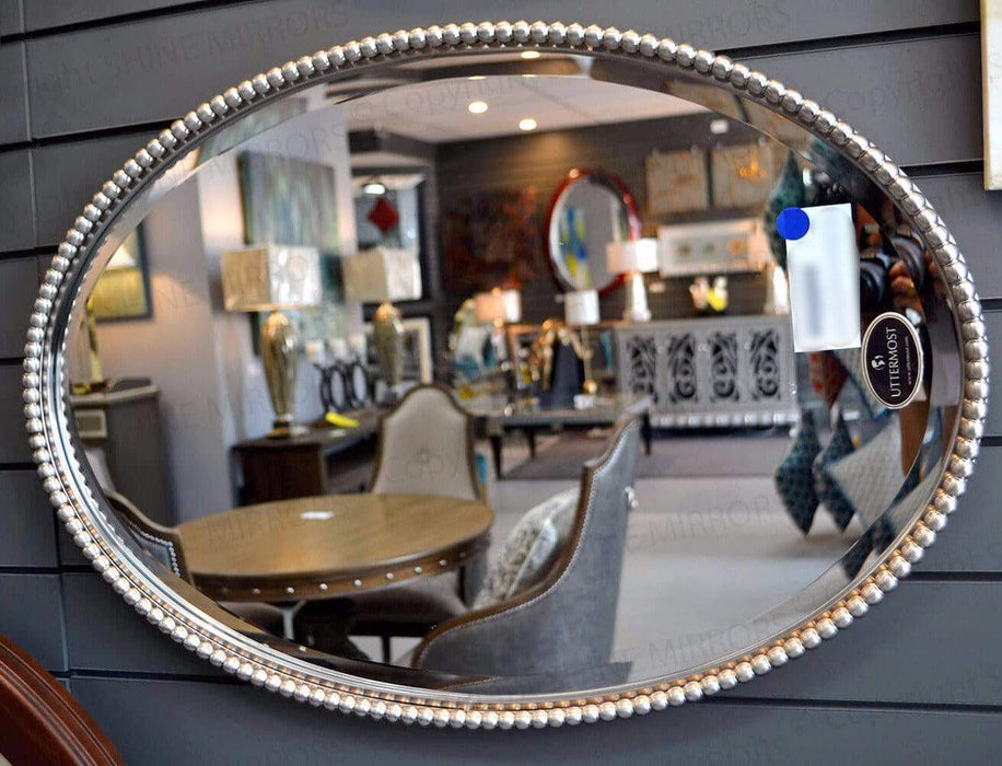 The Uttermost Sherise Oval Wall Mirror emanates beauty, elegance, and class all at the same time. Silver beads line up its nickel-finished frame, which is crafted using hand-forged metal. This gorgeous piece uses a bevelled centre mirror to accentuate the silver bead adorning its frame.