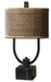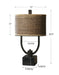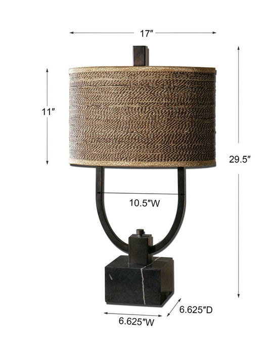 The Uttermost Stabina Metal Table Lamp is a perfect balance between rustic and modern design. The metal frame is finished in a rustic bronze with burnished edges, and set atop a black marble foot. An oval drum shade in brown and tan woven rattan is decorated with trim for a unique, eye-catching look. Add a touch of style to any space.