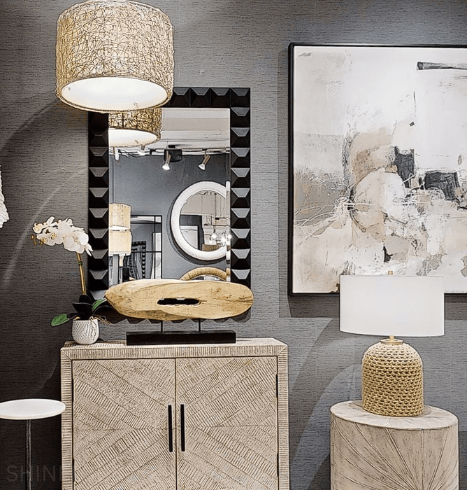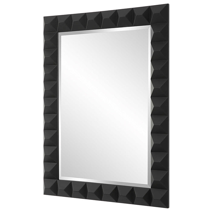 The Uttermost Studded Black Wall Mirror is a classic design updated with a bold 3-dimensional pattern, finished with sleek matte black. The mirror features a generous 3cm bevel, allowing it to be hung horizontally or vertically. Perfect for any space, this mirror is sure to impress.