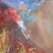A vibrant abstract artwork that showcases rich red and deep blue tones with silver and gold leaf highlights. This hand painted canvas comes with a matte black gallery frame.