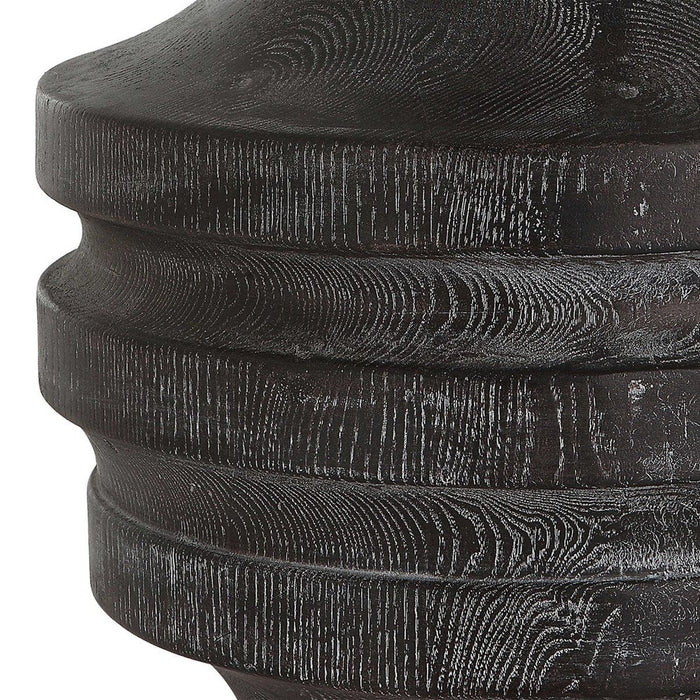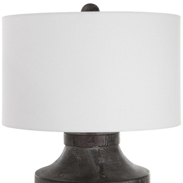 The Uttermost Timber Carved Wood Table Lamp is an ideal rustic addition to any room. Its transparent black stained wood grain is warmed with a light white glaze, creating a beautiful, natural look. This piece is complete with a hardback drum shade, covered in white cotton fabric. Enhance the style of your home today!