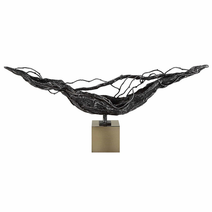 Challenge the limits of your creativity with Uttermost Tranquility Abstract Sculpture. Cast in rustic dark bronze iron, and contained in a unique antique brass iron cube base, you can take a risk on a modern abstract sculpture that will bring interest and depth to any space. Dare to explore its potential as a decorative bowl. Take a chance and make a statement with Uttermost Tranquility.