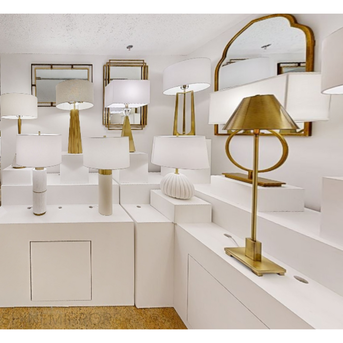 The Uttermost Wessex Table Lamp boasts a base covered in white faux shagreen and accented with iron, all finished in a plated antique brushed brass. Its round hardback drum shade is made of casual white linen fabric for a timeless look.