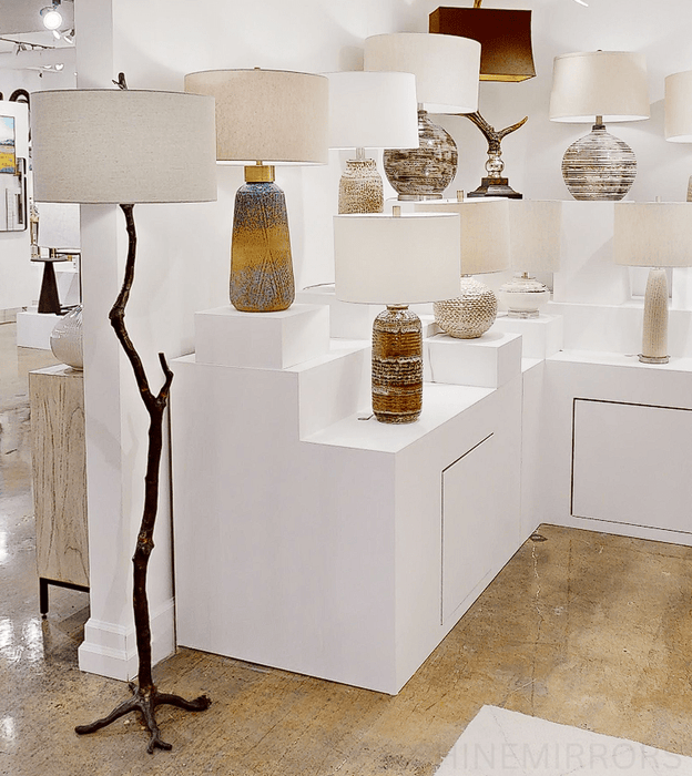 Bring a unique touch to your home with the Uttermost Western Sky Ceramic Table Lamp. Crafted with a distinctive embossed design, it showcases an exquisite blend of matte and gloss glazes in multiple shades of blue-green, indigo, and golden rust. Complemented by antique brass plated details, its light gray linen drum shade provides a perfect finishing touch.