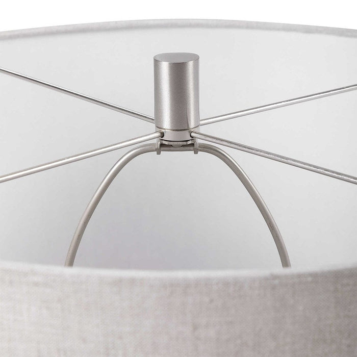 The Uttermost Whiteout Mottled Glass Table Lamp is an elegant and practical addition to any room in your home. The textured glass base is finished in a beautiful mottled aged white and accented with brushed nickel plating. The accompanying round drum shade is made from light oatmeal linen fabric for a soft, natural look.