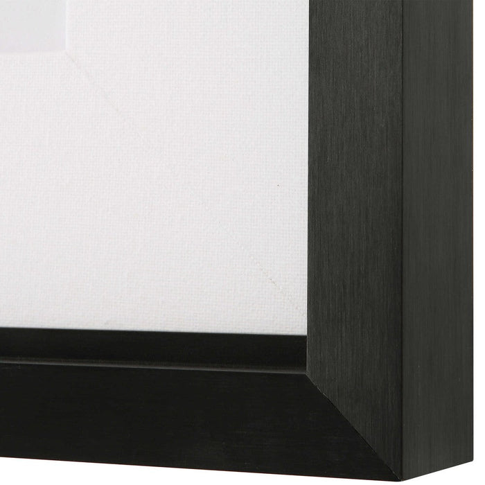 Transform your space with the stunning Uttermost Winterland Framed Prints Set of 2. The warm golden ochre, deep charcoal, and white tones add a touch of cozy elegance to any room. The satin black pine wood frames and natural linen wrapped mat provide a beautiful contrast. Each print is expertly printed on paper with a special matte finish for a truly luxurious look. Artwork by Joyce Combs