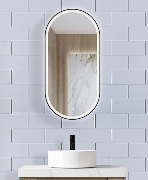 This Varina Black Framed LED Wall Mirror is an innovative mirror with on and off touch control sensor for its LED light strip. Featuring a graceful oval pill shape and outer black finished metal frame, this mirror will boost your contemporary type home. The touch sensor button boosts the functionality of this magnificent LED frontlit mirror.