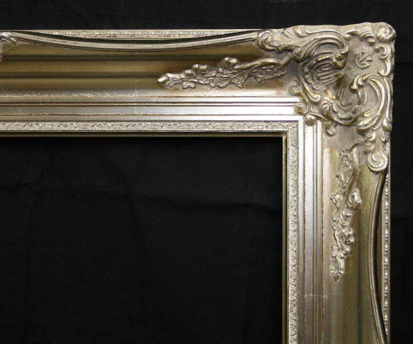 - Silver champagne-finished frame with ornate filigree and floral accents