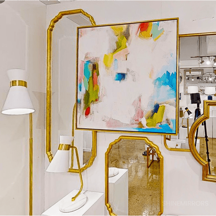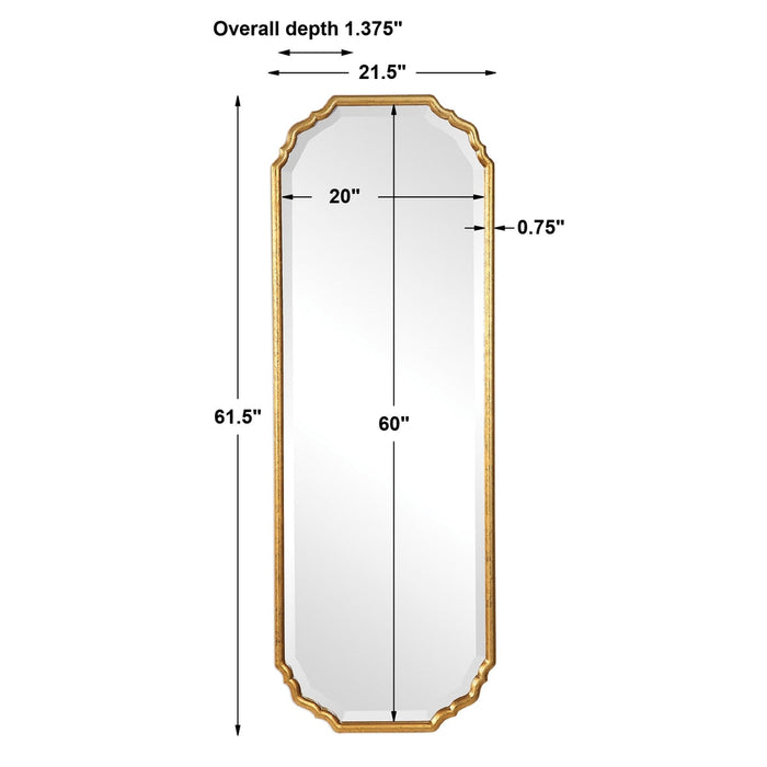 Slender style wall mirror suitable for empty narrow spaces. Its frame has elegant curved corners to add charm, and finished in a lightly antiqued, metallic gold leaf. Centre mirror has a generous 3cm bevel, and can be hung either vertically or horizontally.